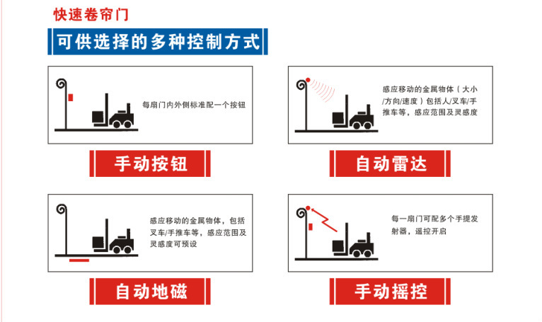 控制方式:龍盛公司為您提供了多種手動或自動控制系統以滿足用戶對門的開啟或開閉方式的要求:1.按鈕式快速門 2.拉繩式快速門 3.遙控式快速門 4.地感式 快速門5.光電紅外快速門 6.雷達感應快速門 7.指紋8.藍牙開啟快速門